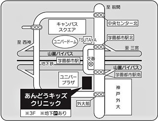 神戸市営地下鉄学園都市駅の改札を出て右に徒歩約1分、1階にsoftbankやマクドナルドなどがある神戸学園都市ビルの3階です。